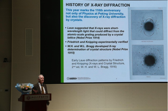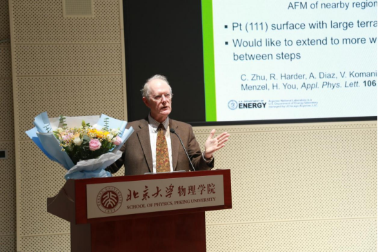 2023年10月12日,北京大学物理学院学术论坛第二十八讲在思源多功能厅成功举办。本次论坛特别邀请美国阿贡国家实验室格雷戈里·布莱恩·斯蒂文森教授(Gregory Brian Stephenson),为大家带来了一场题为“35 Years of In Situ X-ray Scattering Studies of Crystal Surfaces During Growth”的学术报告。此次活动由北京大学物理学院凝聚态物理与材料物理研究所、人工微结构和介观物理国家重点实验室、宽禁带半导体研究中心鞠光旭研究员主持。斯蒂文森教授的开场白提到2023年不仅是北京大学物理学科建立110周年,也是晶体X射线衍射发现110周年。