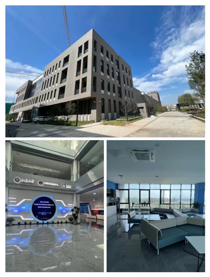 图 从上至下,上:北京激光加速创新中心外景图;下左:北京激光加速创新中心展厅;下右:北京激光加速创新中心交流区
