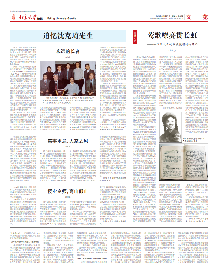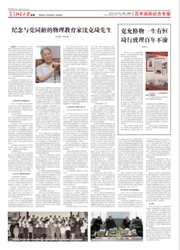2021年10月17日,是我国物理教育家,北京大学物理学院已故教授、原副校长沈克琦先生诞辰一百周年纪念日。北京大学物理学院撰写专稿,激励广大师生了解沈克琦先生的成长历程,学习他对科教兴国育英才的执着追求,弘扬他甘当育人铺路石的中国科学家精神,为建设具有世界影响力的北大物理学科,培养具有科学精神、创新能力、批判性思维的未来领军人才做出更大贡献。